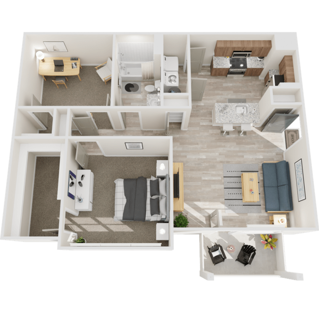Compose your ideal lifestyle in 938 sq ft of beautifully crafted living space. The Elton sets the tone with soaring 9-foot ceilings, a versatile den or home office for work and creativity, and a chef-inspired kitchen featuring polished granite counters, stainless steel appliances, stylish tile backsplash, and pendant lighting above the bar.
