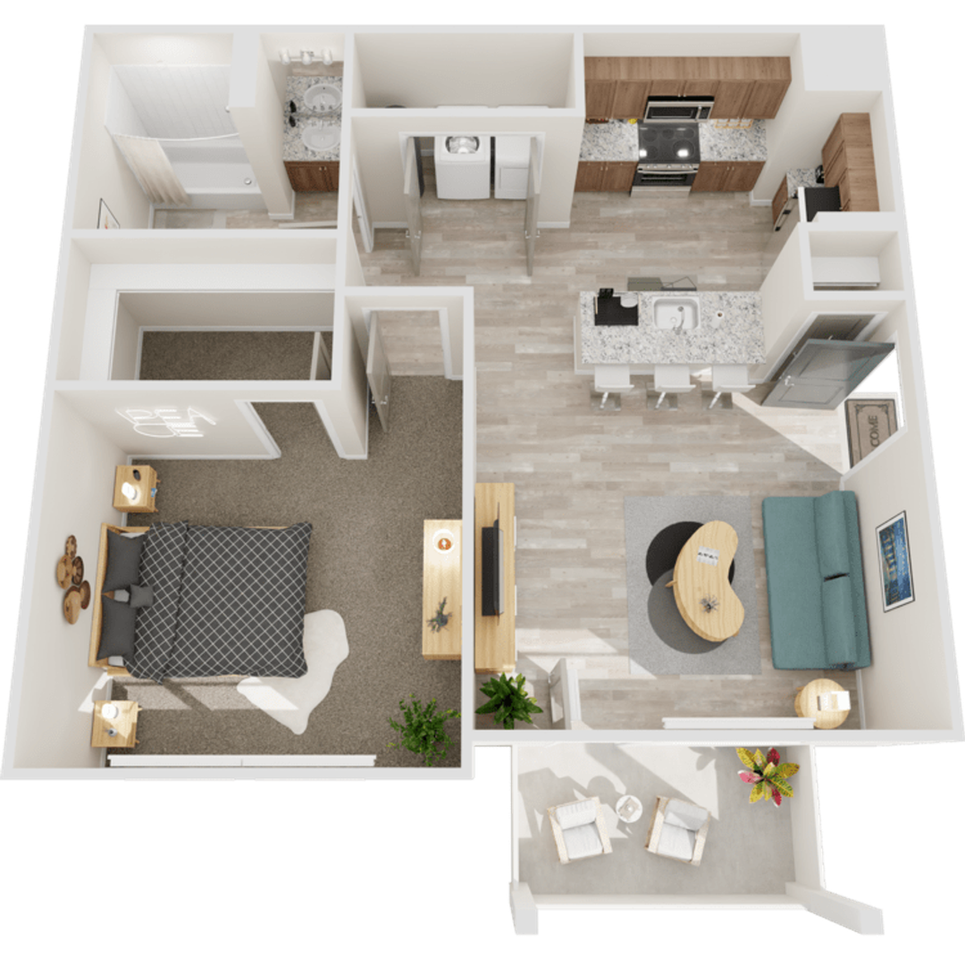 This floor plan harmonizes elegance and convenience with luxury vinyl plank flooring in main living areas, plush designer carpet in the bedroom, and a walk-in closet with built-in shelving for effortless organization. A full-size in-home washer and dryer, plus a complete appliance package, simplify your daily routine.